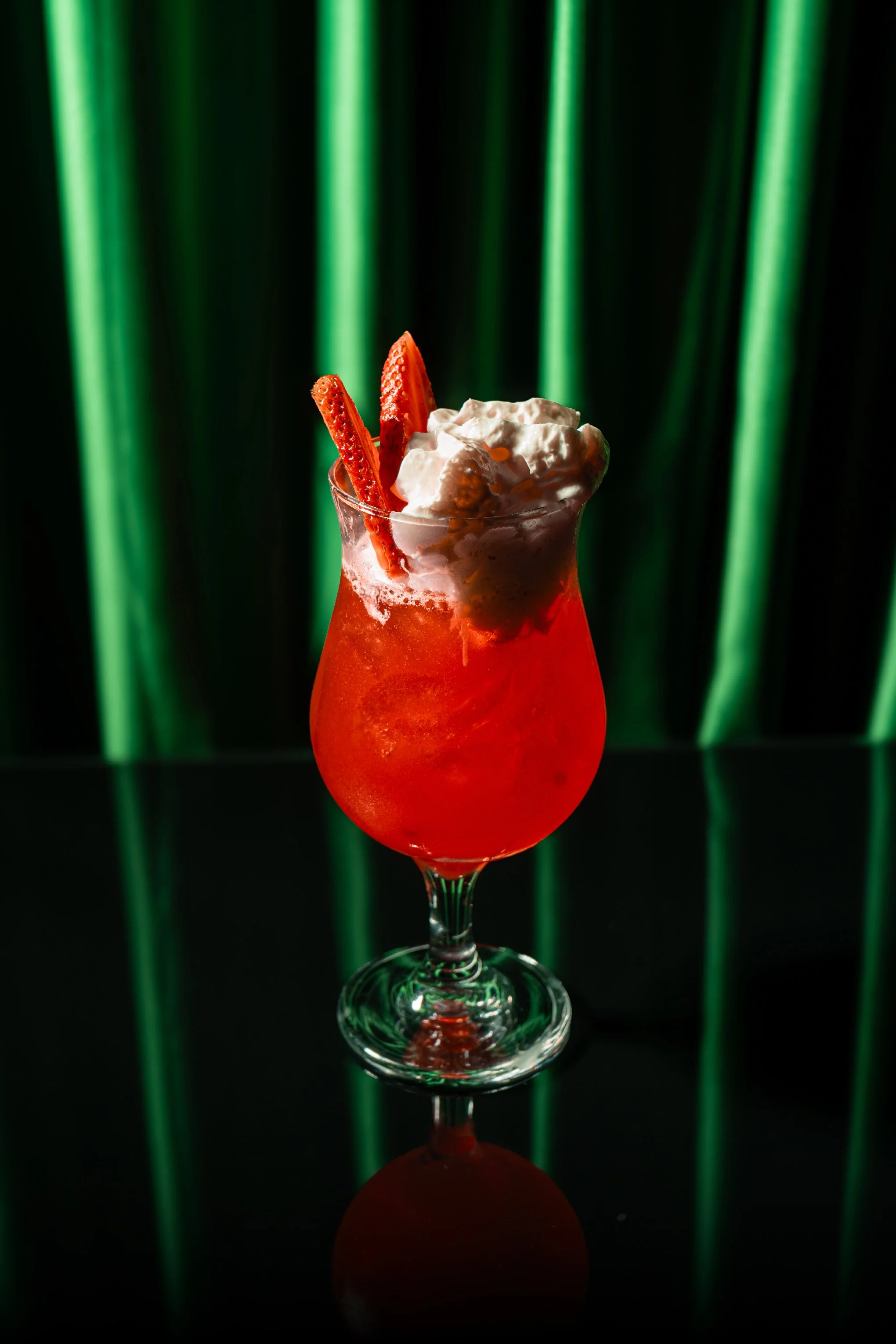 Tequila, reducción de fresa, y crema batida de vainilla.